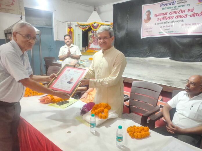 सहारनपुर: सांस्कृतिक समिति विभावरी द्वारा मोक्षायतन योग संस्थान, बेरी बाग में हिंदी दिवस के अवसर पर एक भव्य साहित्यिक समारोह आयोजित किया गया। इस अवसर पर साहित्य और समाज सेवा में उल्लेखनीय योगदान देने वाली दो विभूतियों को सम्मानित किया गया।